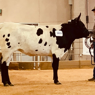 The color kaleidoscope he has in his babies is amazing, from red base to black base, brindle to parker brown, large or small spots, color sided or lace faced he has given us an amazing variety. Although he is black he must carry a variety of genes with the babies on the ground. If by chance you are in need of colored up calves then consider this guy for your herd. Proven with plenty of calves on the ground and registered with both TLBAA and ITLA you can hardly go wrong. His sire is still alive so he should have plenty of years of service still ahead of him.