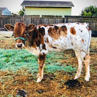 He also has not disappointed in the color department either. No matter if the cow is solid his calves still come out with colored up patterns. He has never thrown a solid colored calf yet. The only one close is Luke our young bull from him that is white, but genetically that means he got two white patterned genes from his parents and when bred to solid cows should always produce a white pattern of some sort, for reference check out double helix ranch color genetic pages.